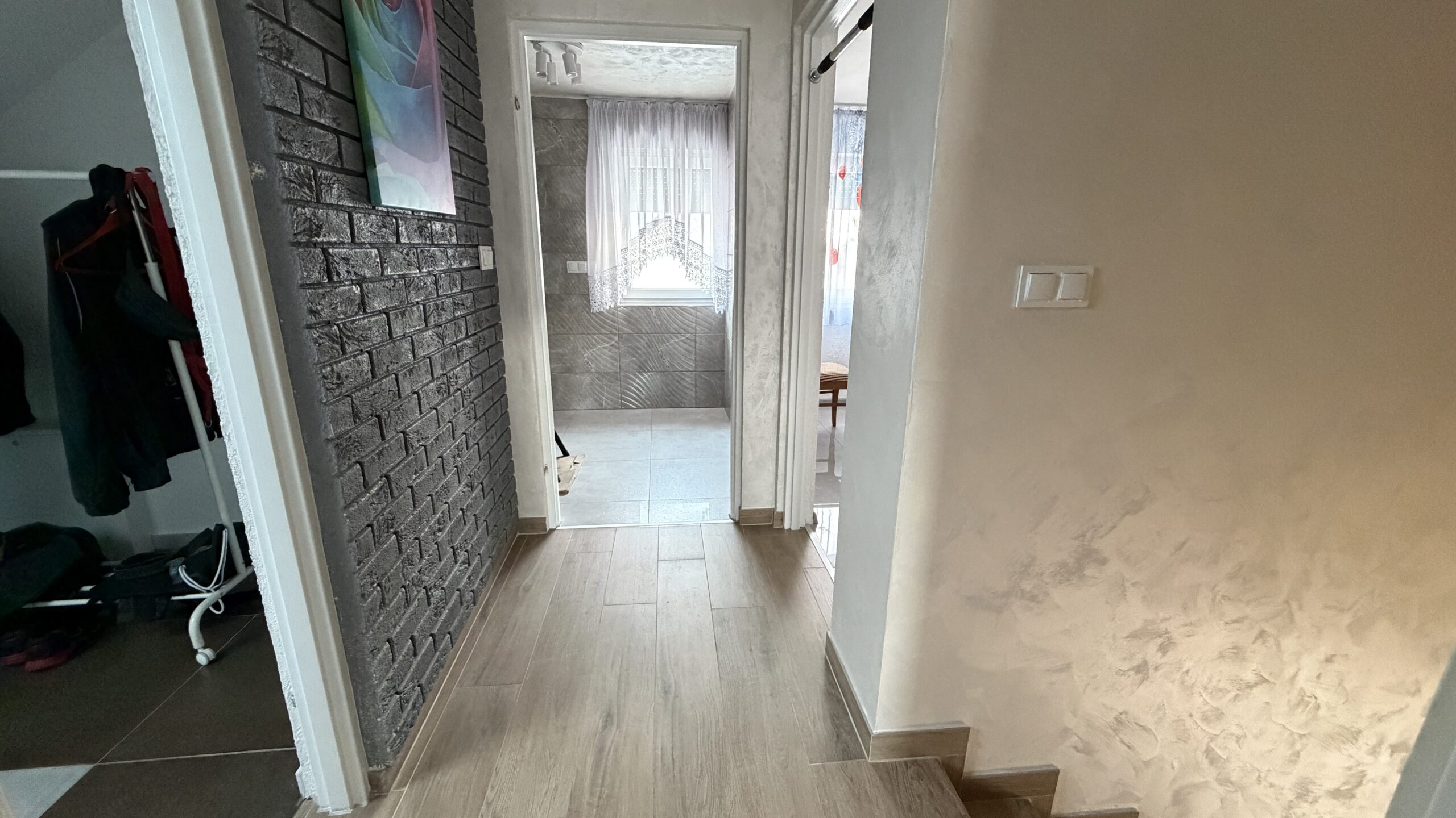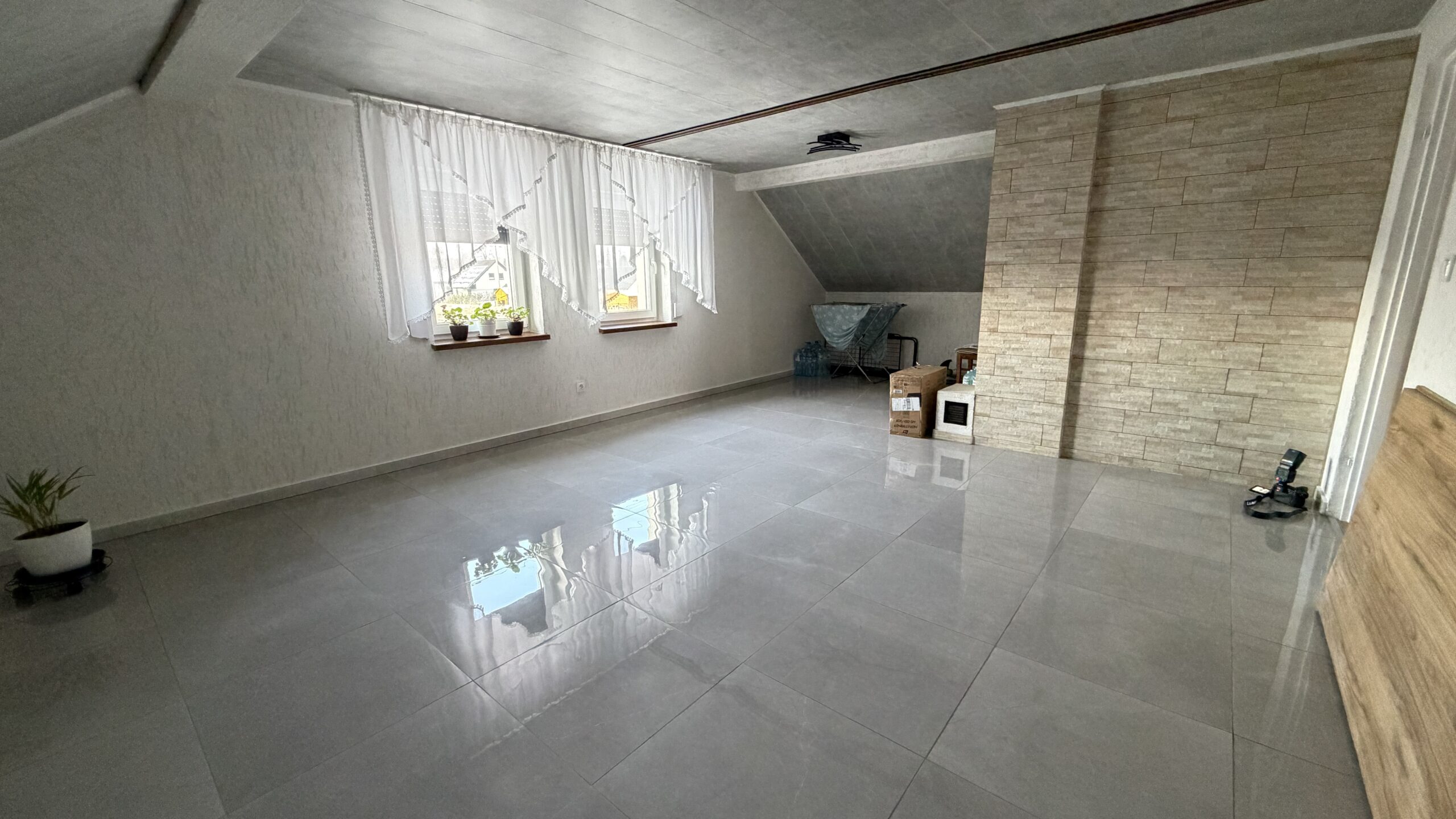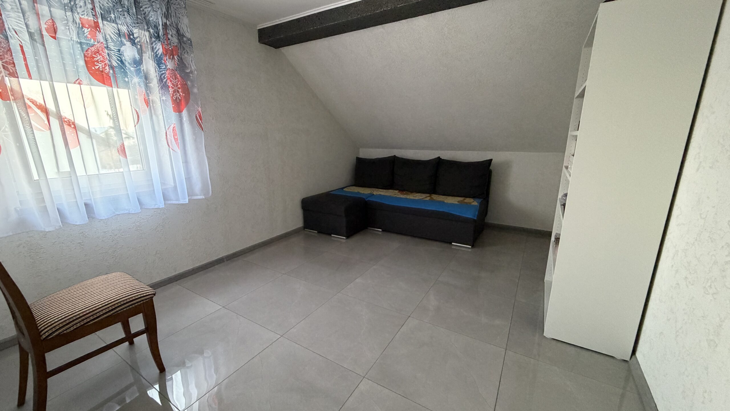 Poddasze składa się dwóch pokoi, łazienki oraz garderoby. Z dużego pokoju na piętrze mogą zostać wydzielone dwa mniejsze pokoje.