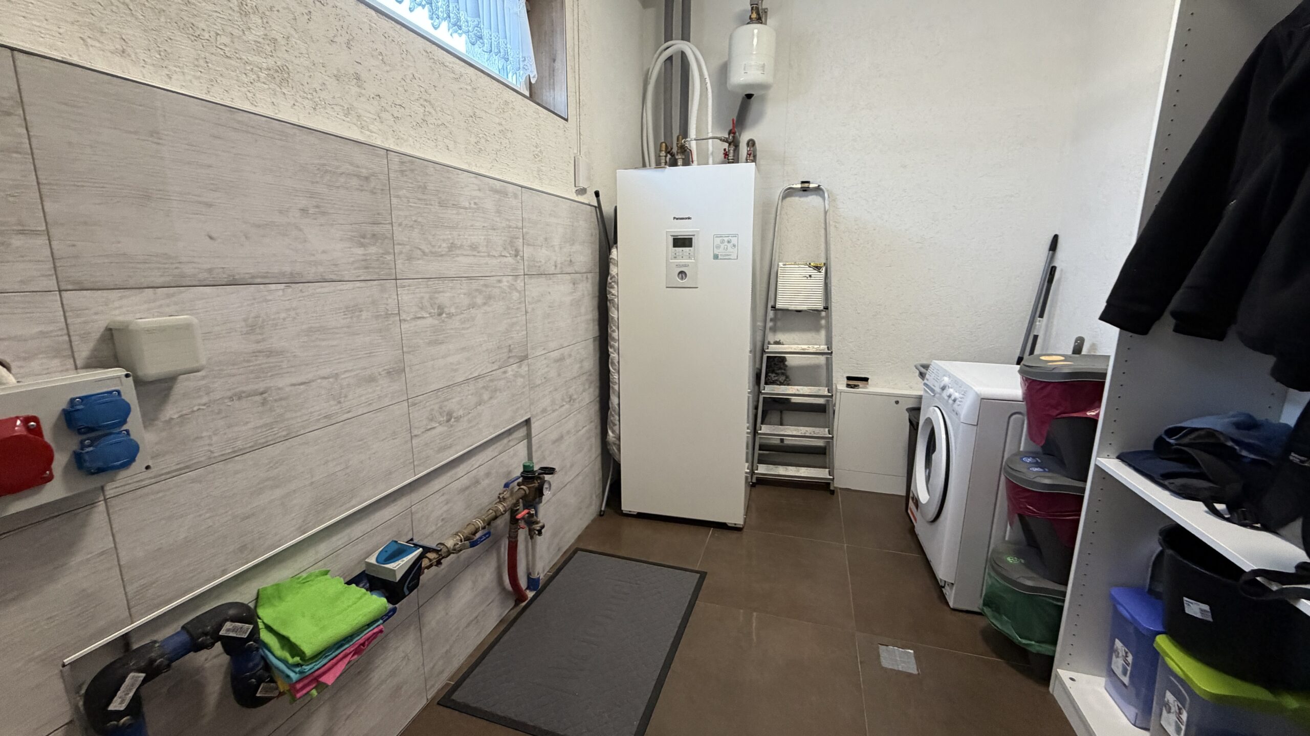 Budynek ogrzewany pompą ciepła. Na parterze i piętrze zainstalowano ogrzewanie podłogowe. W głównym pokoju na parterze znajduje się kominek na drewno z którego ciepło rozprowadzane jest na piętro.