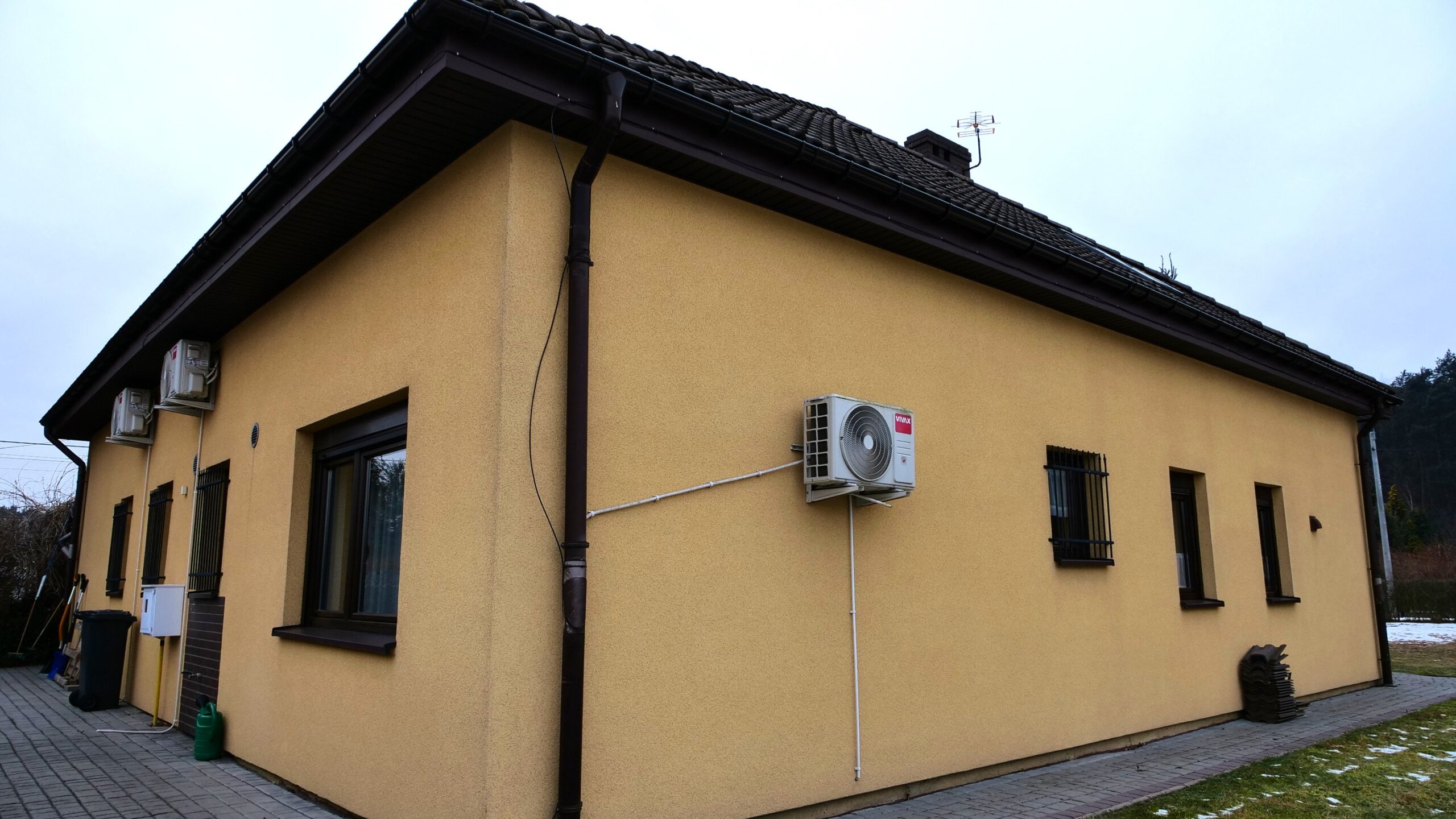 Ogrzewanie – piec gazowy Vitodens firmy Viessmann spalający gaz płynny propan. Za domem znajduje się zbiornik firmy GASPOL o pojemności 4850 m2.