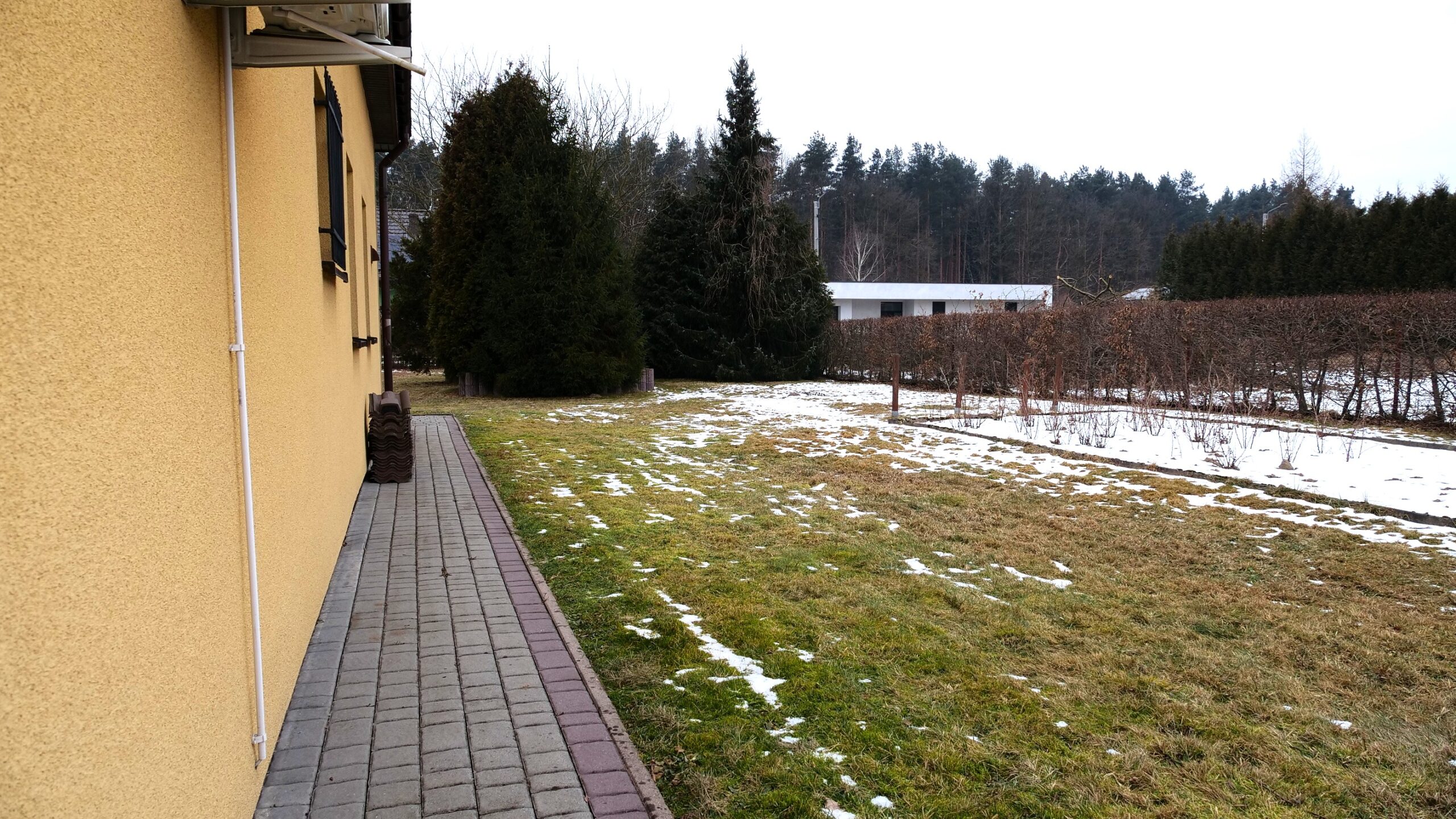 Całość nieruchomości tworzy ogrodzony, wybrukowany teren z bramą wjazdową. Od zachodniej strony z salonu jest wyjście na zadaszony taras. Od strony południowej w bryle budynku znajduje się wiata na samochód.