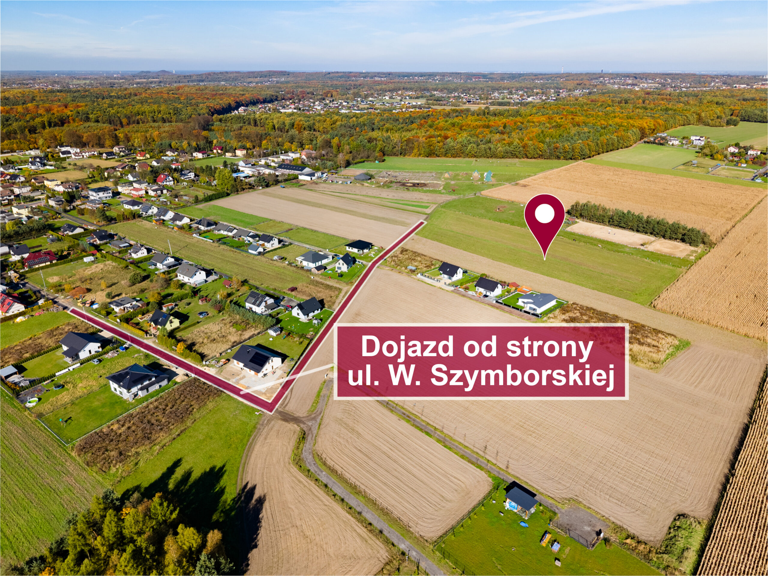 Dojazd do nieruchomości odbywa się drogą gminną ulicą W. Szymborskiej oraz Stanisława Lema.